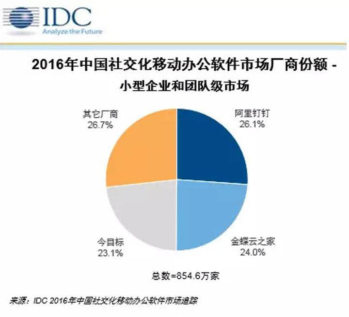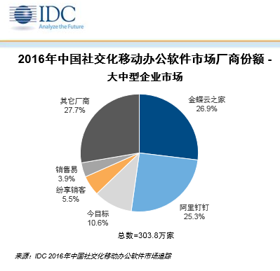 據《IDC2016 中國社交化移動辦公軟件市場跟蹤陳訴》顯示,截止 2016 年末,中國社交化移動辦公軟件市場累計注冊用戶達到1. 6 億人,累計企業用戶達到1158. 4 萬家。在大中型企業市場(企業員工人數在250
