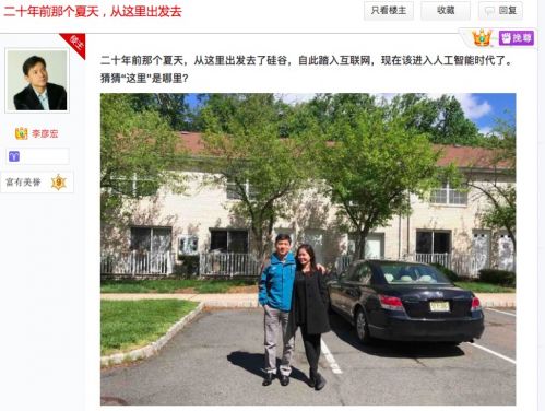 也是在6月27日這天,李彥宏現(xiàn)身貼吧,曬出一張與妻子馬東敏的合照,還讓貼吧網(wǎng)友猜猜合照地點。有猜“你家后花園的”,也有猜是在華爾街的。6月28日李彥宏本身公布了答案:新澤西州SCOTCH PLAINS。李彥宏與妻子正是在美國留學時相識,當時馬東敏正在美國新澤西州大學生物系就讀。