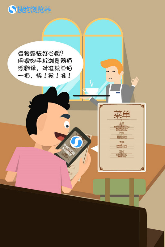 在國外的餐廳用餐最尷尬的事情莫過于完全看不懂英文菜單,著急之后一頓盲點,結果菜上桌后才發現點的全部都是湯,好心酸!不想錯過美食卻又看不懂菜單,如何點餐?搜狗手機瀏覽器拍照翻譯功能,只需對準菜單拍一拍,拍出來的相片直接釀成中文菜單,想吃什么隨便點,再也不消擔心會點錯餐。