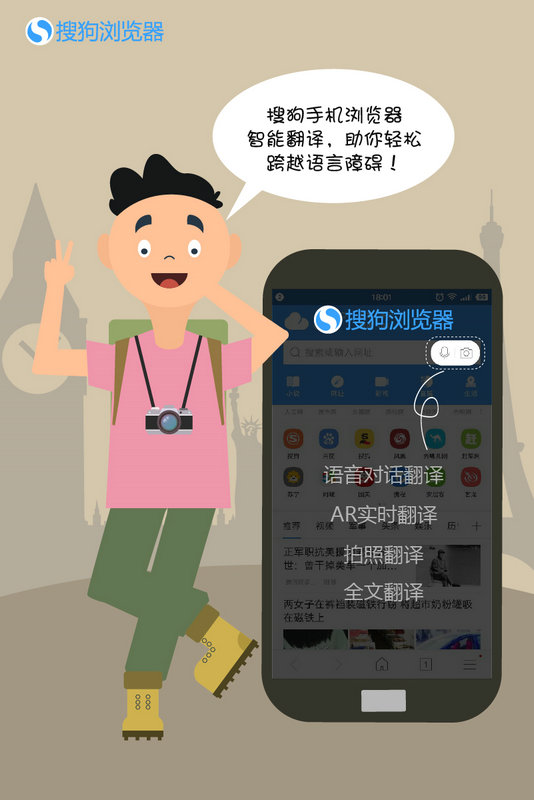 隨著暑期的臨近,又將掀起一輪暑期出境游的熱潮。然而對于很多英文較差的游客而言,因語言欠亨帶來的尷尬總是不能幸免:坐在心儀已久的餐廳點餐卻看不懂菜單,只能吃著盲點的五成熟帶血牛排默默下咽;拿著精心準備的旅游攻略卻看不懂路上的指示牌,找人問路更是連比劃帶說也講不明白……語言上的交流障礙或多或少會影響出國旅行的體驗,為此搜狗手機瀏覽器安卓版特別推出了智能翻譯功能,集語音對話翻譯、AR實時翻譯、拍照翻譯和全文翻譯四大核心功能于一體,助你輕松跨越語言障礙,不懂英文照樣也能環游世界。