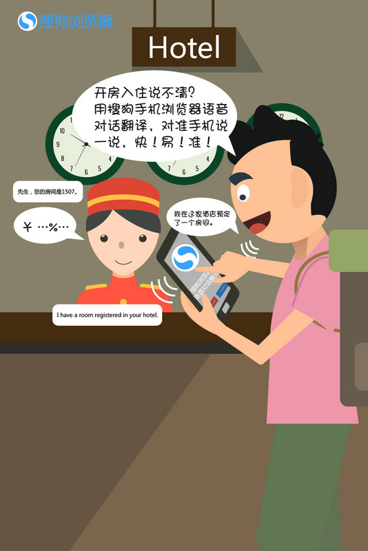 來到預定的酒店,面對前臺辦事員的笑臉相迎,卻無法用英文進行順利的溝通,即便加上肢體語言,,連比劃帶說也表達不清本身對房間住宿條件的實際要求。交流難,難在語言欠亨。搜狗手機瀏覽器語音對話翻譯功能,徹底打破語言欠亨的交流障礙,只需對著手機說出你想翻譯的話,搜狗手機瀏覽器就會翻譯成對方的語言并說給對方聽,中英互譯快易準,你一句來我一句,溝通交流就這樣輕而易舉的完成。