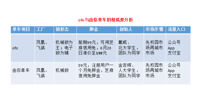 阿星在本年四月騎行由你單車時,就發(fā)現(xiàn)由你與小黃車的高度相似性,二者均是通過微信公眾號輸入單車的車牌號開啟或掃碼開啟,配置的是機械鎖。據(jù)了解,由你單車創(chuàng)始人金吉暉是人大學(xué)生, ofo創(chuàng)始人戴威也是北大學(xué)生;由你單車第一批投放是在人大校園,而ofo起源于北大校園。二者之間差距主要是在車輛顏色和押金額度上。
