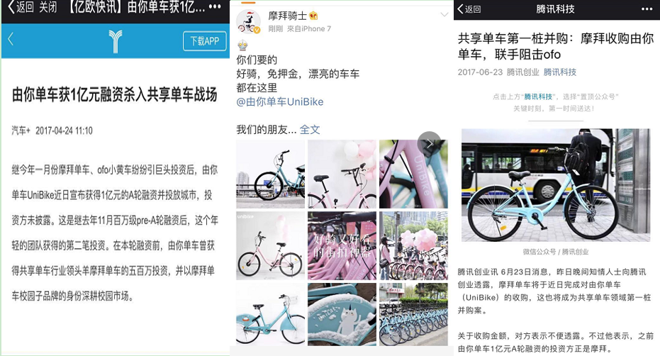 阿星記得,摩拜在正式頒布頒發(fā)完成E輪融資之前,提前一周擺布把獨家信源透露給騰訊科技,鑒于騰訊與摩拜的投資關(guān)系,如此重要的通稿必然經(jīng)過摩拜方面的把關(guān)。別的,摩拜官微“摩拜騎士”曾向粉絲“安利”由你單車“好騎、免押金、標(biāo)致”,這表白由于摩拜單車戰(zhàn)略投資由你單車,兩家早就“眉目傳情”了。