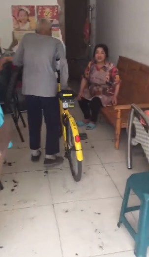 對女子的勸阻,,白叟并不理會,狠狠拍了一下共享單車,繼續把車往里推。