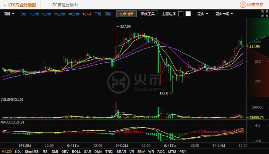按照中國安適可信賴的萊特幣交易平臺火幣網(wǎng)行情顯示,截至北京時間 6 月 14 日 13 點,萊特幣價格為217. 86 元人民幣?;饚啪W(wǎng)萊特幣今日開盤價格為206. 75 元,目前最高價格 223 元,最低價格為206. 3 元,漲幅5.44%。