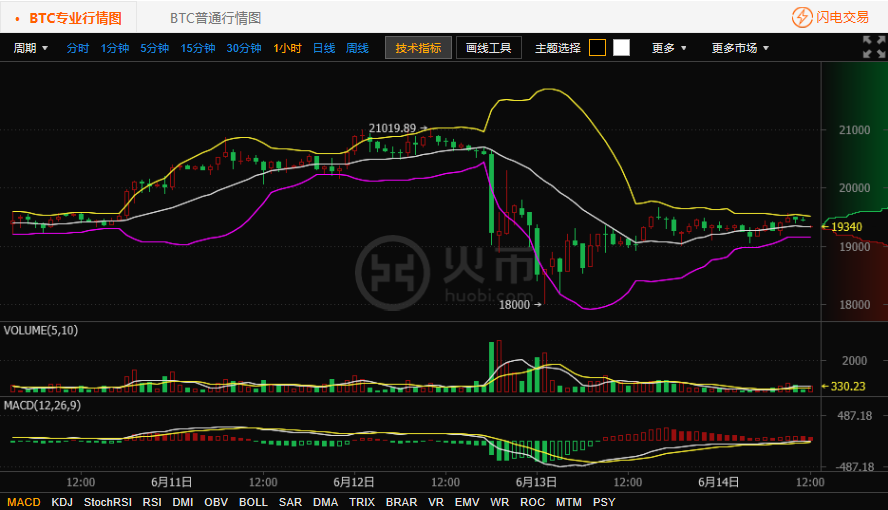 看火幣網(wǎng)比特幣行情小時圖。目前火幣網(wǎng)比特幣價格在箱體19000- 19600 元震蕩,均線在該位置逐步粘合,,成交量極度縮小,變盤節(jié)點逐步臨近。MACD看,指標(biāo)自昨日 8 時呈現(xiàn)低位金叉后,紅柱逐步增高,價格小幅攀升,表白多頭力量持續(xù)占優(yōu)。BOLL來看,指標(biāo)持續(xù)收口,幣價運動區(qū)間越來越窄,后市面臨標(biāo)的目的選擇?;饚啪W(wǎng)溫馨提示:投資有風(fēng)險,入市需謹(jǐn)慎。