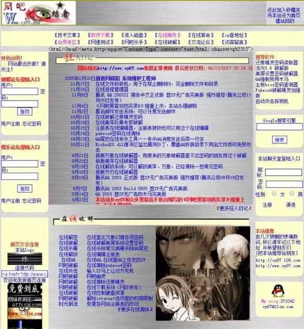12年前的cy07網站,風格簡單,滿懷時代氣息我對破解好像有天生的興趣。我會去看《電腦報》、《電腦喜好者》上面一些跟黑客有關的文章,也去瀏覽一些黑客網站。不過真正開始破解則是在因為想要便利上網的緣故。