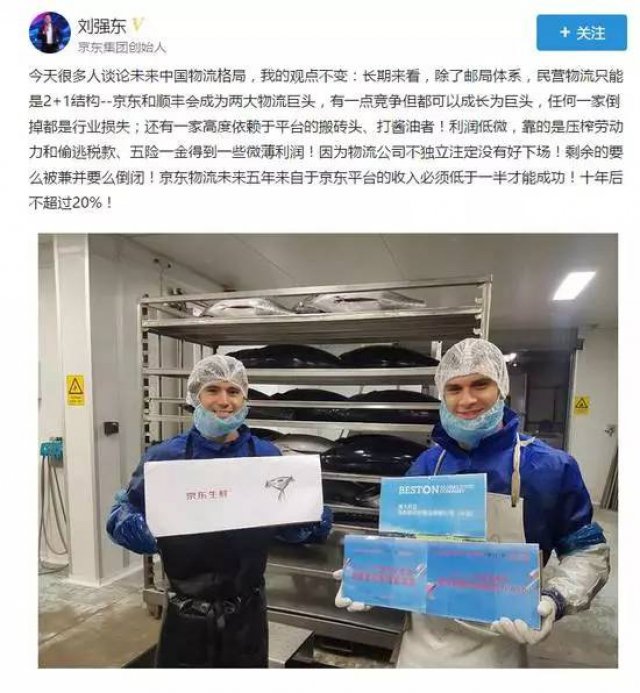 他體現(xiàn),除了郵局體系,民營(yíng)物流只能是2+1結(jié)構(gòu),其中的“2”是指京東和順豐,雙方有一點(diǎn)競(jìng)爭(zhēng)但都可以成長(zhǎng)為巨頭,任何一家倒掉都是行業(yè)損失。而“1”則暗指菜鳥,劉強(qiáng)東指責(zé)高度依賴菜鳥的物流公司只是搬磚頭、打醬油者,靠的是壓榨勞動(dòng)力和偷逃稅款、五險(xiǎn)一金獲得一些微薄利潤(rùn)。