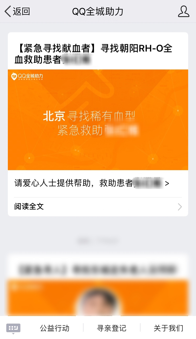 同時,與傳統尋人方式比擬,QQ全城助力發布的信息更具備可控性。例如傳統稀有血型公益組織會借助QQ群、伴侶圈等社交媒體平臺擴散求助信息,但是當匹配成功后相關消息還是會在社交平臺繼續擴散;而在QQ全城助力中,當成功尋找到志愿者后會推送“已結案”的信息,使求助信息可控,進而為社會節省公益資源。