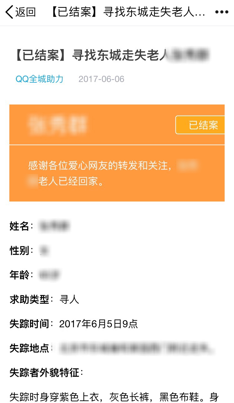 除了幫手稀有血型患者匹配志愿者外,QQ全城助力2. 0 通過與聯合公安部、民政部以及權威NGO組織的深度合作基于人臉識別及LBS技術精準定位、識別走失白叟信息,共向志愿者推送走失白叟信息,成功尋回 6 名離家走失白叟。
