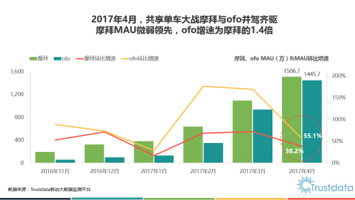 這么分析下來,不難發現摩拜自一開始的模式就決定了摩拜或許可以做成一個“小而美”的品牌,但卻支撐不起全球性共享單車平臺這樣的體量。而自 2016 年共享單車“彩虹大戰”開始以來,摩拜的幾次失敗的大手筆營銷幾乎都成了ofo快速增長的契機。Trustdata的數據表白,ofo4 月用戶環比增速高達55.1%,高于摩拜的38.2%,ofo月度用戶增速為摩拜的1. 4 倍,這已經是用戶增速已經是連續第 8 個月超越摩拜。業內人士遍及認為, 2017 年將是共享單車行業洗牌之年,未來的行業格局基本將在本年奠定。而從行業現狀以及權威數據來看,ofo無疑將成為最終的勝出者。