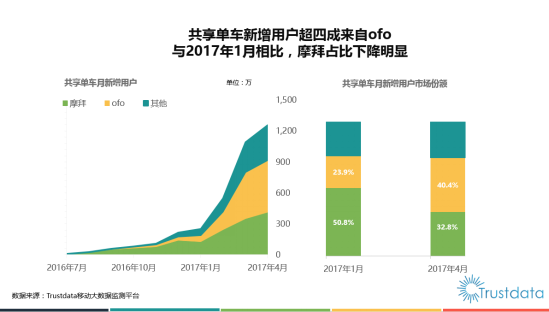 然而,來自Trustdata、易不雅觀、艾媒、艾瑞等多家行業權威機構的數據卻共同顯示出摩拜在這場“彩虹大戰”中的全面敗退。例如Trustdata的數據顯示,整個 4 月共享單車行業的用戶增量為 1200 萬,其中40.4%的新增用戶份額來自ofo,約為 485 萬,32.8%的新增用戶份額來自摩拜,僅為 393 萬,遠遠低于摩拜官方宣稱的 2400 萬人。此外,很多摩拜的用戶已經發現,如今不但紅包車的數量大幅減少,想在城市里找到一輛價格為 30 分鐘0. 5 元的Mobike