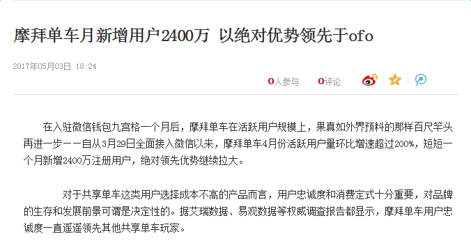 Lite的兩倍,盡管摩拜入駐了微信九宮格,但由于ofo隨處可見,用戶依然會選擇ofo。