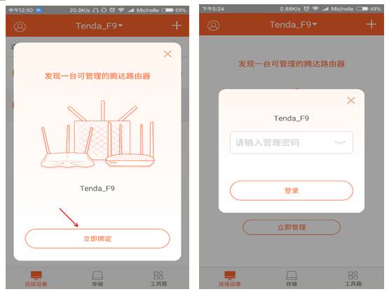 這時(shí)頁(yè)面會(huì)彈出“發(fā)現(xiàn)一臺(tái)可辦理的騰達(dá)路由器”,點(diǎn)“立即綁定”提示綁定成功即可。如果路由器設(shè)置了登錄密碼,需輸入登錄密碼后才能綁定。