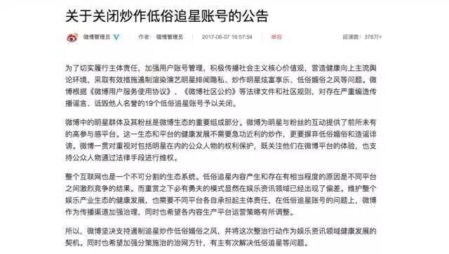 這其中,微博的動作最受矚目。終究,,在昨日下午的聲明中,微博本身也承認“明星群體及其粉絲是微博生態的重要組成部分。”