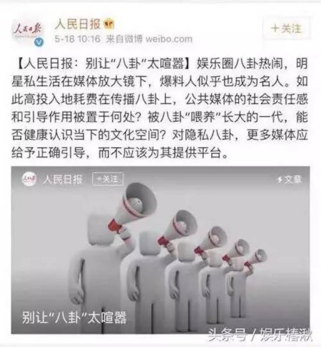 先是5月18日,《人民日報》發布《別讓“八卦”太囂張》一文。