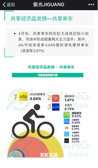 市場滲透率方面,ofo以4.04%的市場滲透率穩居行業第一,摩拜單車以3.87%滲透率跟隨其后、排名第二。