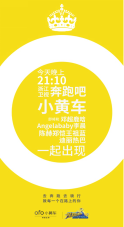 浙江衛視和ofo小黃車均公布最新宣傳海報: 6 月 2 日晚21:10,ofo小黃車將加入最熱綜藝節目《奔跑吧》第五季第八期的節目中,為伐木累成員以及明星嘉賓提供專屬坐騎,并成為伐木累游戲環節的重要專屬道具。并且,產后復出歸回伐木累的Angelababy也將與小黃車同框。