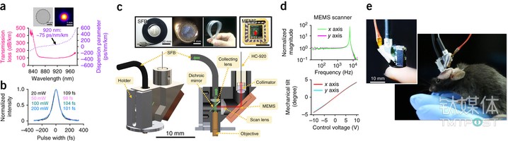 “從微型化、分辨率、成像速度綜合來看是國際領(lǐng)先的。”北京大學(xué)分子醫(yī)學(xué)研究所程和平院士介紹稱,該顯微鏡采用雙軸對稱高速微機電系統(tǒng)轉(zhuǎn)鏡掃描技術(shù),成像幀頻達 40Hz(256*256 像素),具備多區(qū)域隨機掃描和每秒 1 萬線的線掃描能力;并采用了自主研發(fā)設(shè)計的光子晶體光纖,可實現(xiàn) 920nm 激光傳輸;熒光信號的接收則采用自主研發(fā)的柔性光纖束,制止了動物活動時熒光傳輸光纜拖拽而受到干擾的難題。