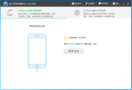 4.在軟件界面中選擇“從iTunes備份文件恢復”功能,軟件將會檢測電腦上的備份設備,如果您沒有使用iTunes備份過蘋果手機數據,請選擇iPhone設備掃描恢復。點擊連接在電腦上的設備,,再點擊開始掃描。