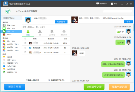 5.掃描完成后,在軟件左側可以看到聯系人、短信、微信等。右下角別離是“導出選中記錄”和“導出全部記錄”。