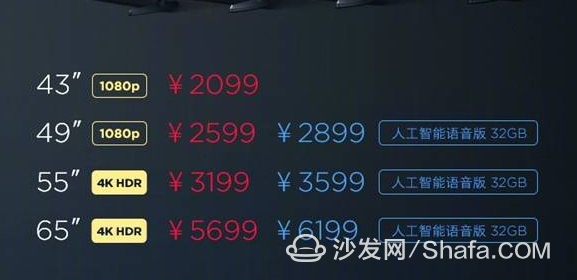 小米電視4A 43、49、55、 65 英寸尺度版售價別離為 2099 元、 2599 元、 3199 元、 5699 元;49、55、 65 人工智能語音版售價別離為 2899 元、 3599 元、 6199 元。