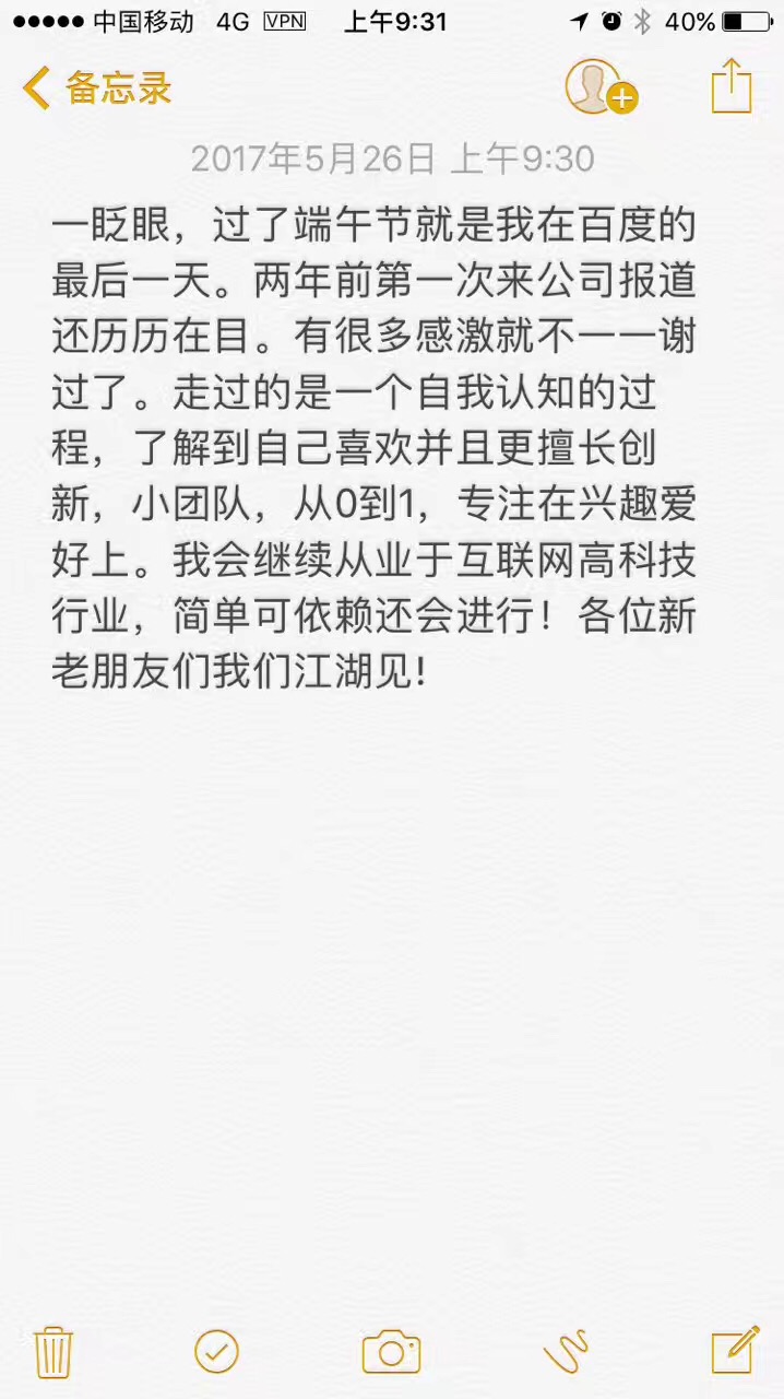 鈦媒體快訊 | 5月26日消息:百度副總裁陸復斌今日在伴侶圈頒布頒發即將離開百度,,陸復斌透露,過了端午節就是其在百度的最后一天,本身會繼續從業于互聯網高科技行業。