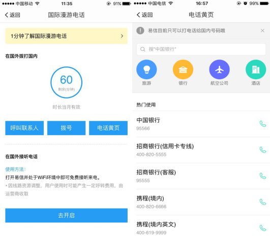 除了臨時工作方面需要及時與國內取得聯系外,改訂機票、查詢住宿信息、與國內銀行溝通等棘手情況也時有發生,為了便利用戶在境外與國內各領域及時取得聯系,易信國際漫游貼心內置的電話黃頁,存儲大量辦事號,并進行分類整理,可以使用戶輕松聯系國內的機場、酒店、銀行及垂直類旅游網站,及時解決機票改期、酒店換房等問題,幫手用戶減少旅途中的煩心事,開脫出境游中不安的“小情緒”。