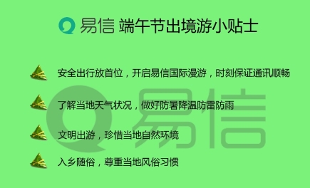 除通訊外,面對境外陌生的生活環境,易信還為各位出行伴侶準備了四條端午節出游小貼士,幫手用戶做好行前準備: