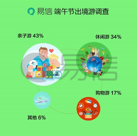 由于端午節正好連著“六一”兒童節,本年端午假期不少父母選擇帶著孩子出境游玩,據易信網絡調查數據顯示,親子游的比例高達43%,超過休閑游的34%,17%的網友傾向于購物游,另有6%的網友選擇了其他。