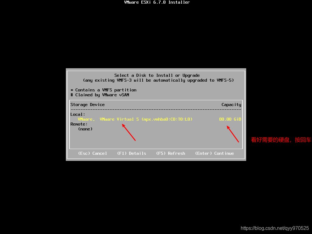 5.系統會自動檢查可用存儲設備,如果有需要,自己手動選擇,按上下鍵,選中之后按回車繼續,注意ESXI會格式化整個硬盤