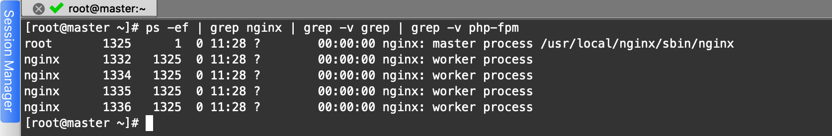root 1325 1 0 11:28 ? 00:00:00 nginx: master process /usr/local/nginx/sbin/nginx