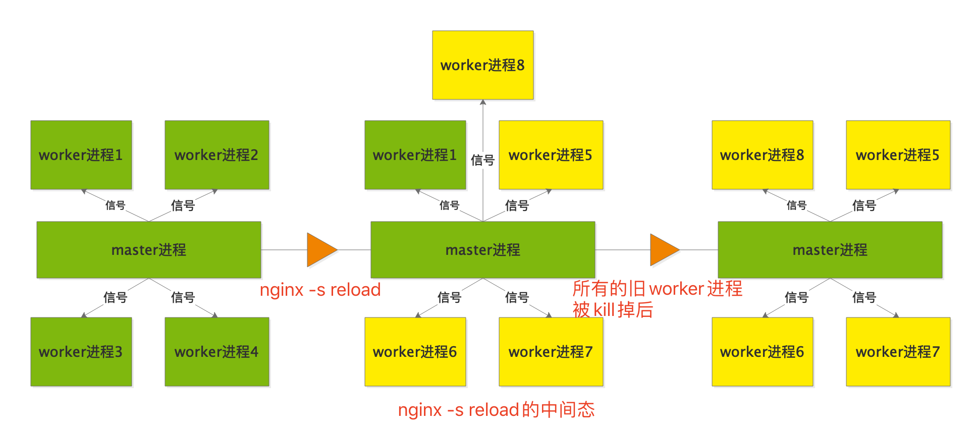 4.執(zhí)行reload命令,master進(jìn)程會(huì)創(chuàng)建4個(gè)(與你配置有關(guān))新的worker進(jìn)程(我上圖中的黃色worker進(jìn)程),關(guān)閉掉舊的空閑worker進(jìn)程(綠色worker進(jìn)程),而正在處理請(qǐng)求的舊worker進(jìn)程不會(huì)立即關(guān)閉,而是會(huì)等請(qǐng)求處理完畢就關(guān)閉。