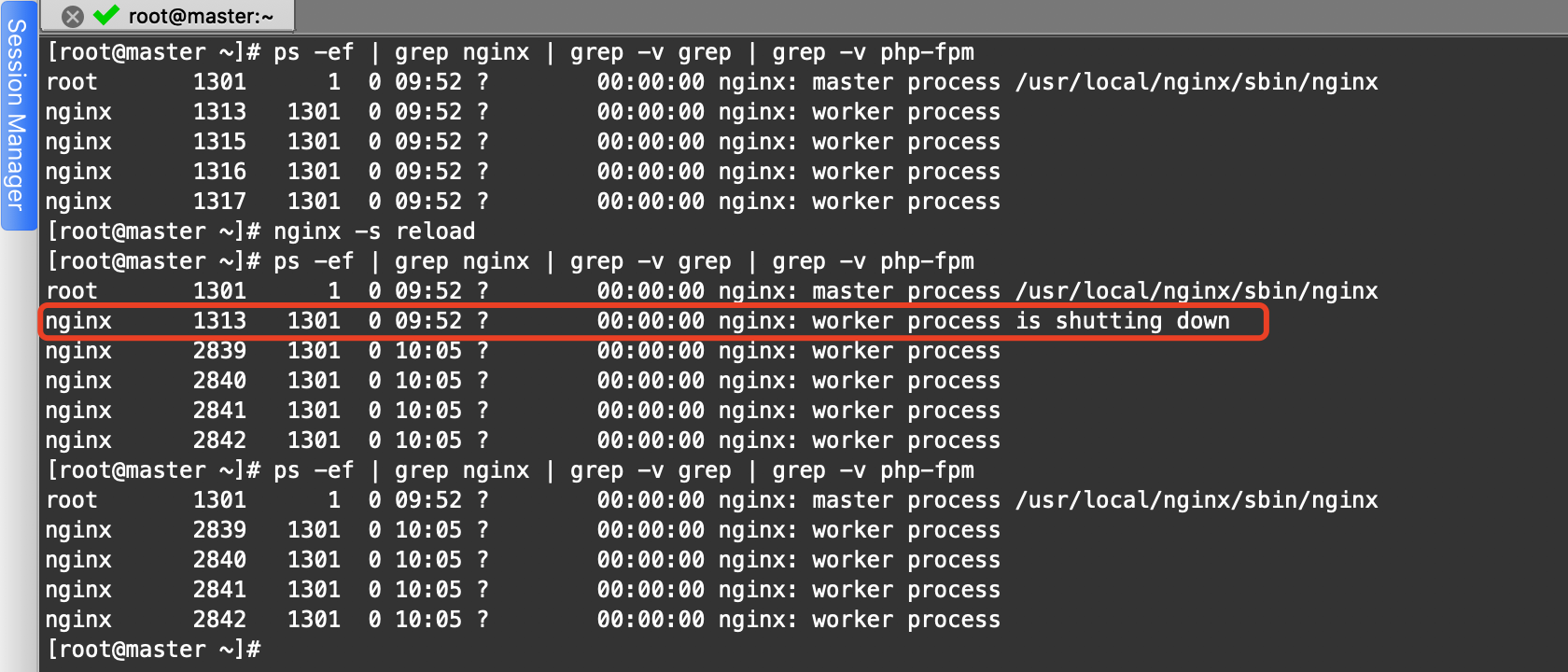 [root@master ~]# ps -ef | grep nginx | grep -v grep | grep -v php-fpm