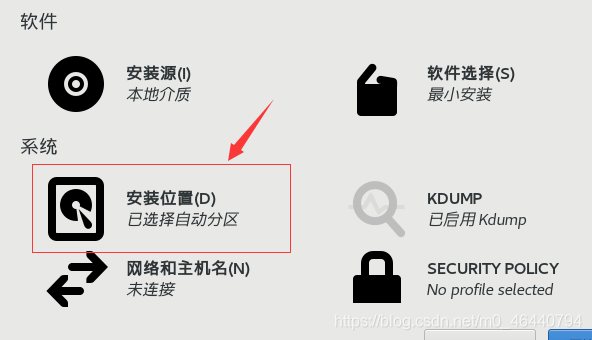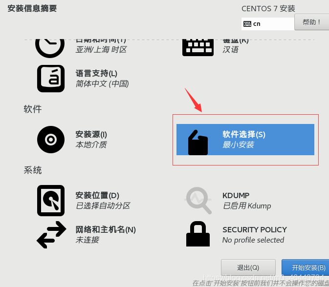 8. 進(jìn)行軟件選擇,最小安裝即為linux基本功能,為命令行界面,學(xué)習(xí)足夠用:【也可選擇帶gui的服務(wù)器或Gonme桌面,有類似windows系統(tǒng)的界面,我這里以最小化安裝演示】