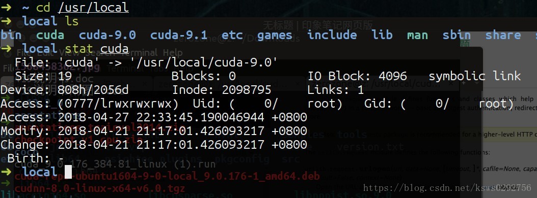 可以看到,文件類型是symbolic link,而指向的目錄正是/usr/local/cuda-9.0,當我們想使用cuda-9.1版本時,只需要刪除該軟鏈接,然后重新建立指向cuda-9.1版本的軟鏈接即可(注意名稱還是cuda,因為要與bashrc文件里設置的保持一致)