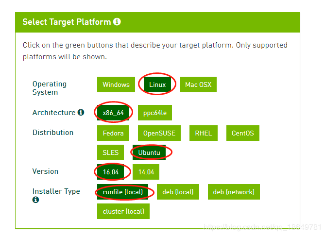 在相應提供的下載鏈接的界面,按照如下所標注的內容進行:(我本人的是 Ubuntu服務器,16.04的,在這里我們選擇runfile的安裝形式)