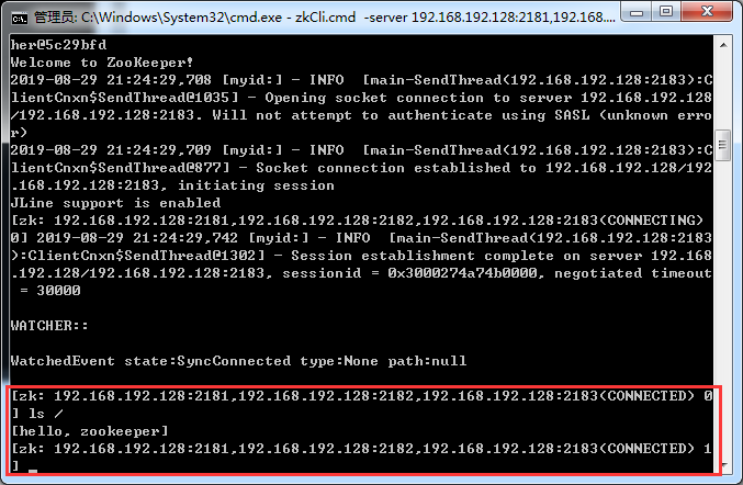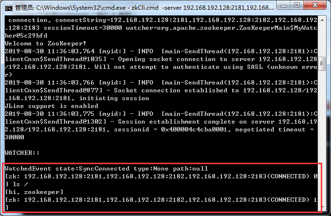 zkCli.cmd -server 192.168.192.128:2181,192.168.192.128:2182,192.168.192.128:2183
