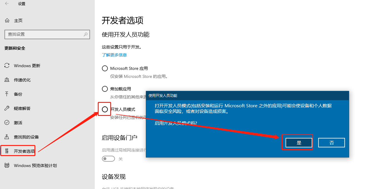 設置-->更新和安全-->開發者選項-->開發人員模式