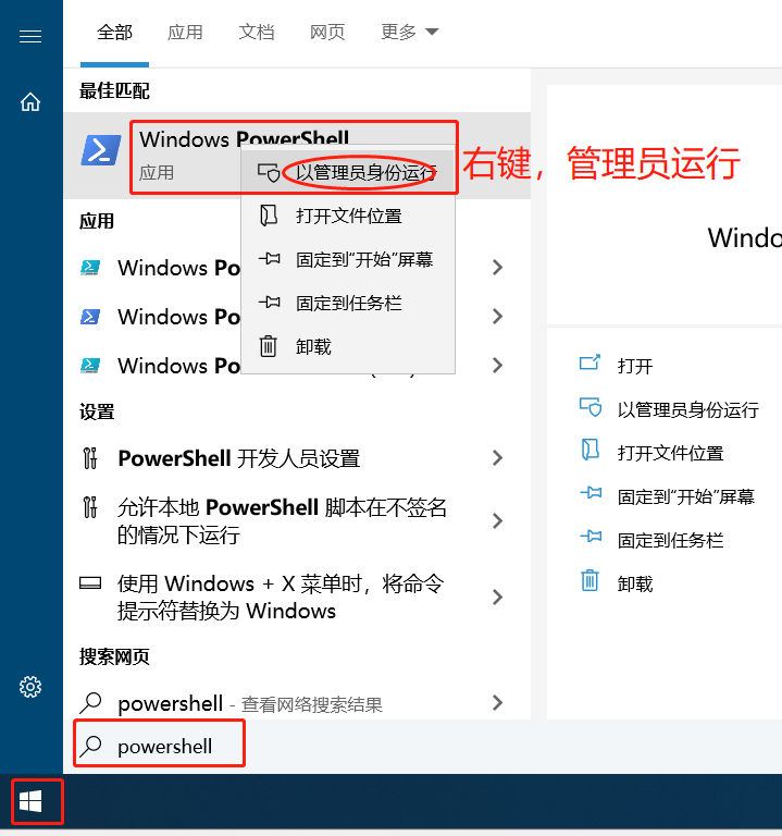 按下 Windows 鍵,搜索 PowerShell 右鍵,以管理員身份運行