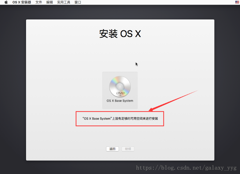 啟動客戶機,進入 MAC 系統配置界面,常規下一步操作。直到出現沒有足夠的可用空間來進行安裝。