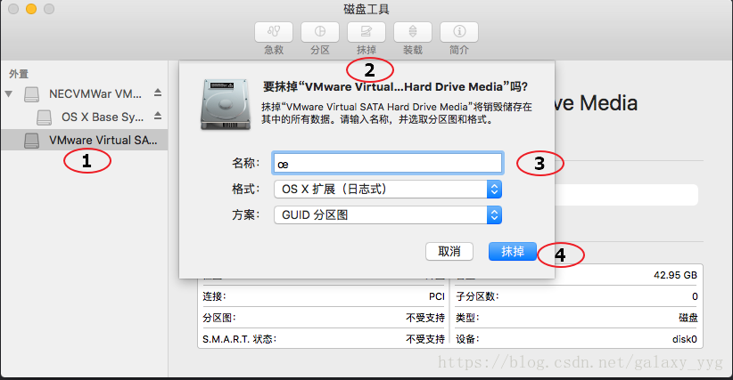 點擊屏幕上方的 “實用工具 -> 磁盤工具”。選中 “ vmware workstation SATA hard drive media ”,點擊 “抹掉”。