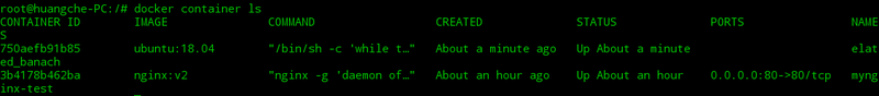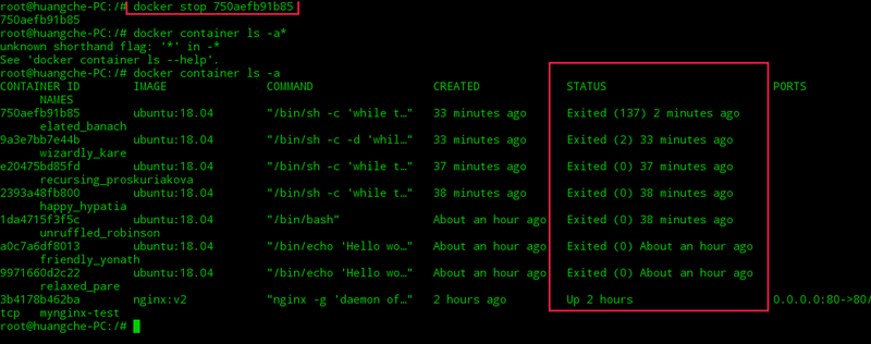 終止狀態的容器可以用 docker container ls -a 命令看到。例如: