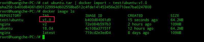 cat ubuntu.tar | docker import - test/ubuntu:v1.0