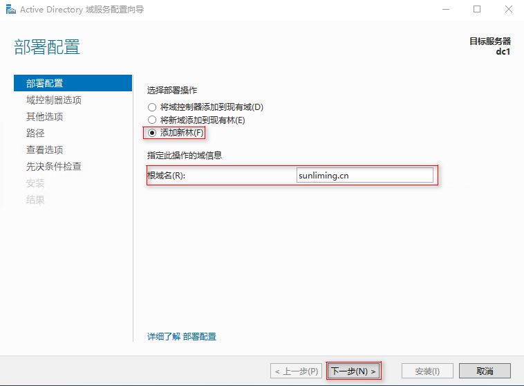 2)因?yàn)槭堑谝粋€(gè)AD控制器,點(diǎn)添加新林,根域名處填域名sunliming.cn,點(diǎn)下一步
