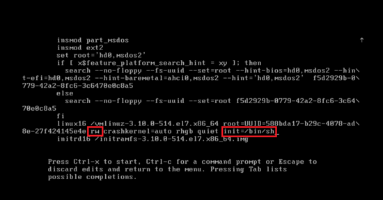 4.編輯修改兩處:ro改為rw, 以及在該行的最后面添加init=/bin/sh