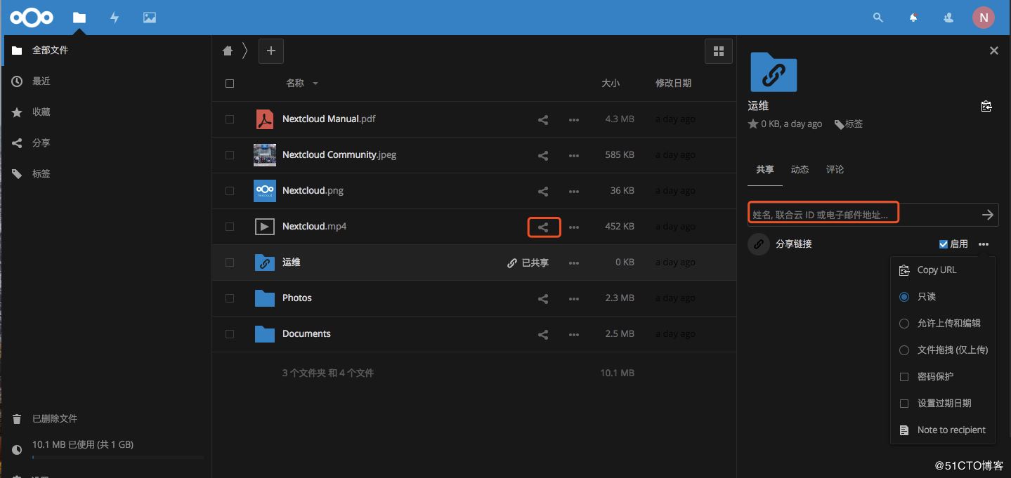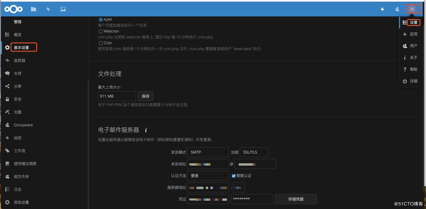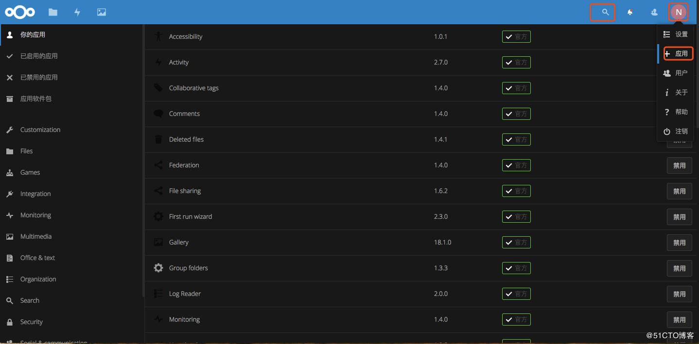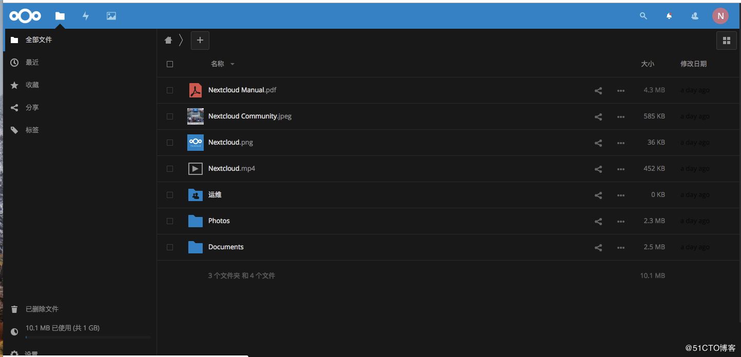 所有初始化配置填寫(xiě)完畢之后,等待大約半分鐘左右安裝完成就可以看見(jiàn) Nextcloud 的主目錄頁(yè)面