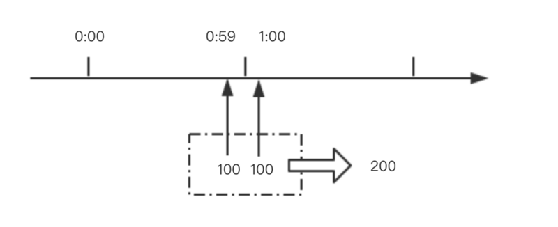 如下圖所示,在1:00前一刻到達100個請求,1:00計數器被重置,1:00后一刻又到達100個請求,顯然計數器不會超過100,所有請求都不會被攔截;