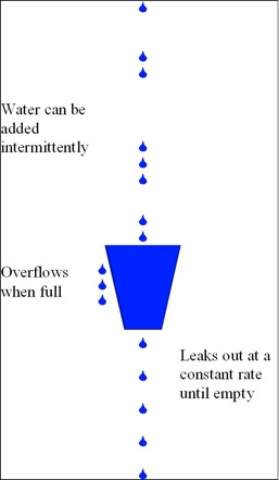 如下圖所示,有一個固定容量的漏桶,按照常量固定速率流出水滴;如果桶是空的,則不會流出水滴;流入到漏桶的水流速度是隨意的;如果流入的水超出了桶的容量,則流入的水會溢出(被丟棄);