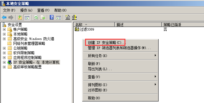 1、首先打開ip安全策略:控制面板–管理工具–本地安全策略–IP安全策略,在本地計算機上。在右側空白處右擊,選擇創(chuàng)建IP安全策略